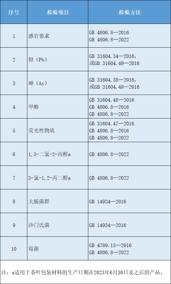在檢驗依據方面,《細則》對不同類別的茶葉包裝產品提出了具體的檢驗項目和檢驗依據,具體涉及GB 4806.7-2016《食品安全國家標準 食品接觸用塑料材料及制品》、GB 4806.8-2016《食品安全國家標準 食品接觸用紙和紙板材料及制品》、GB 4806.8-2022《食品安全國家標準 食品接觸用紙和紙板材料及制品》、GB 4806.9-2016《食品安全國家標準 食品接觸用金屬材料及制品》以及GB 4806.10-2016《食品安全國家標準 食品接觸用涂料及涂層》等現行有效的企業標準、團體標準、地方標準及產品明示質量要求的相關條目。具體內容如下: