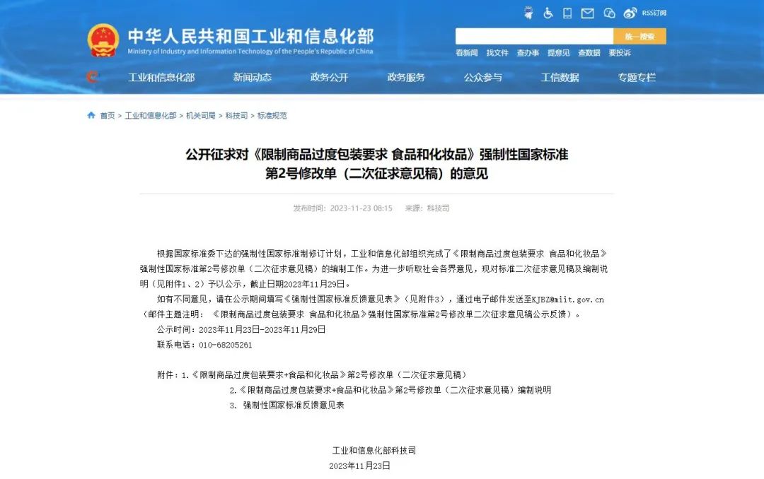 11月23日,工業(yè)和信息化部官網(wǎng)發(fā)布消息:根據(jù)國家標(biāo)準(zhǔn)委下達的強制性國家標(biāo)準(zhǔn)制修訂計劃,工業(yè)和信息化部組織完成了《限制商品過度包裝要求 食品和化妝品》強制性國家標(biāo)準(zhǔn)第2號修改單(二次征求意見稿)的編制工作,并對標(biāo)準(zhǔn)二次征求意見稿及編制說明進行了公示,截止日期為2023年11月29日。